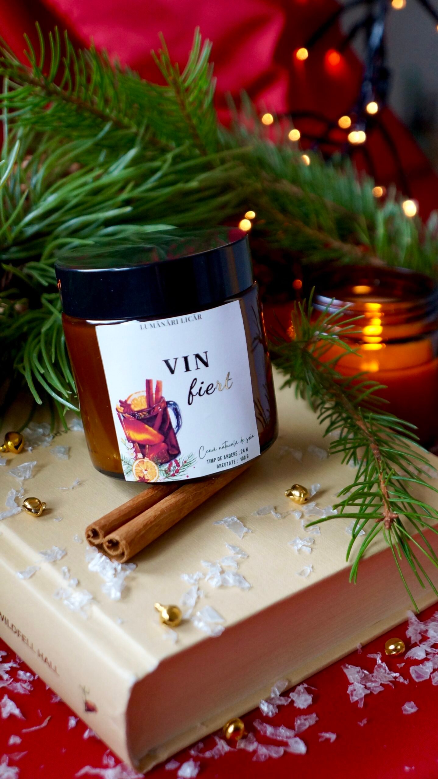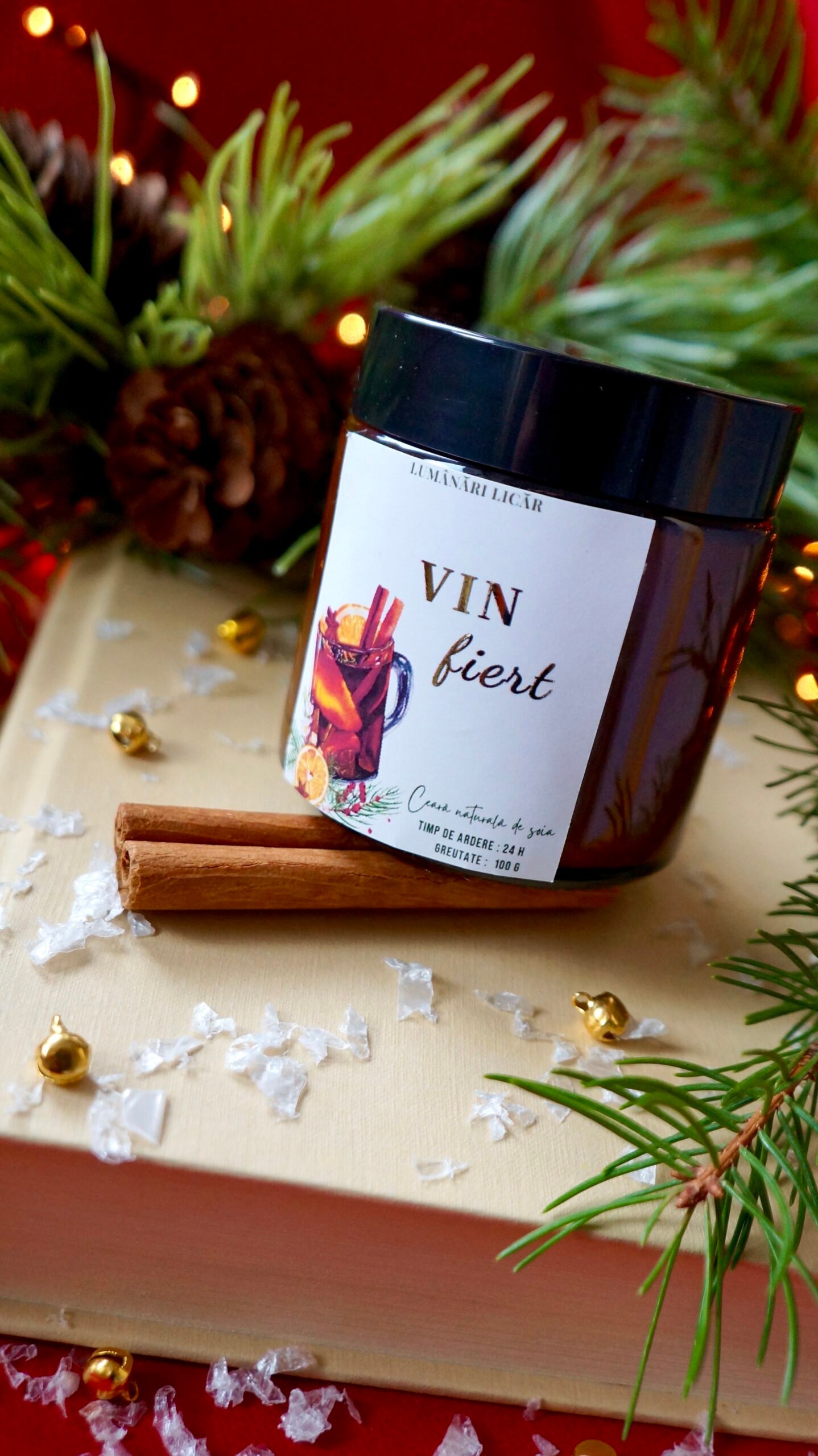 Recipient sticlă ambră mic cu parfum de vin fiert. Etichetă elegantă specifică cu elemente aurii.