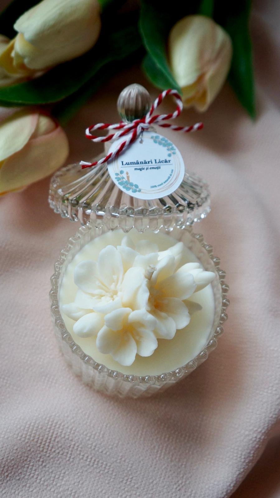 Lumânare parfumată din ceară de soia, turnată manual în bombonieră de sticla.