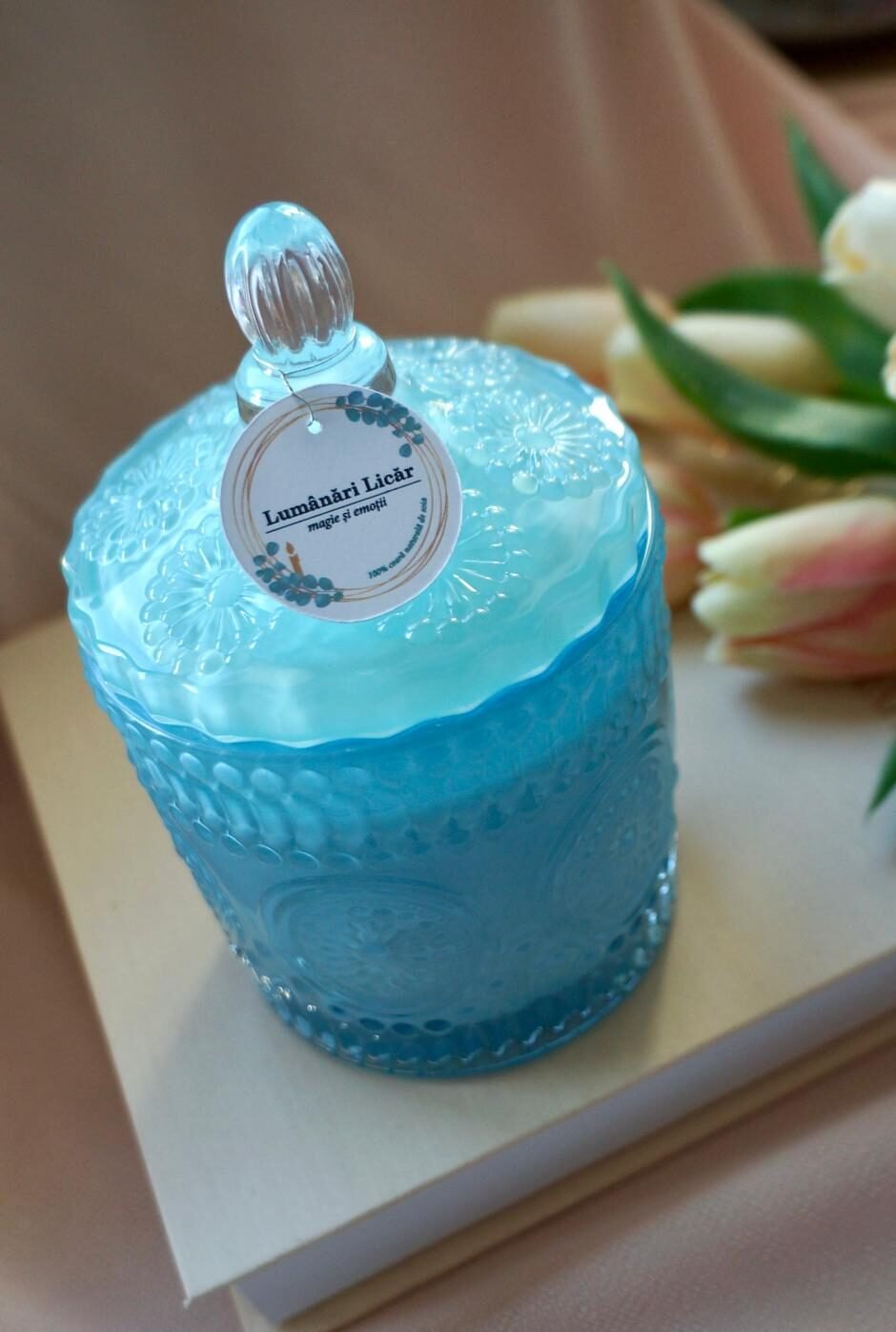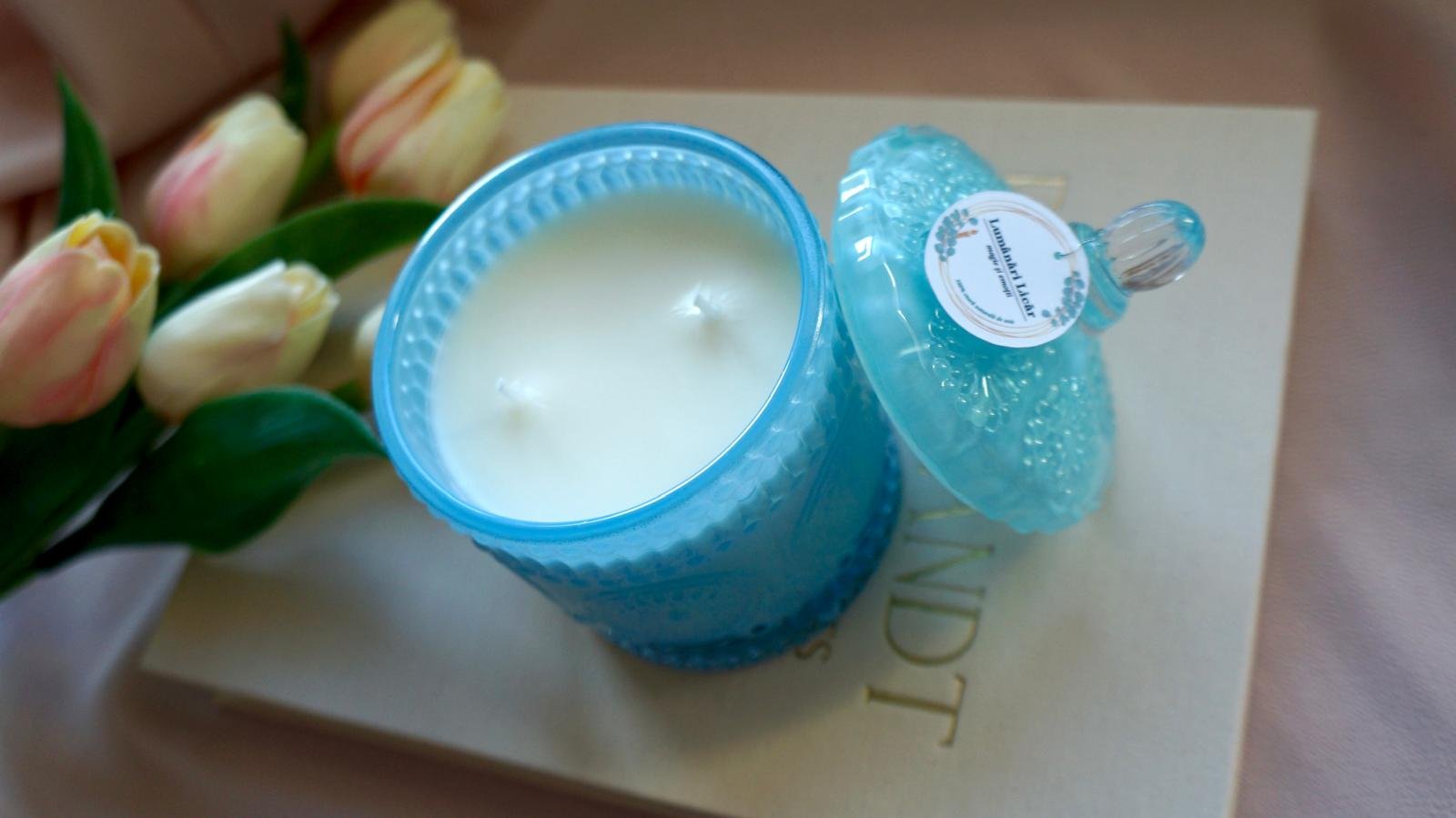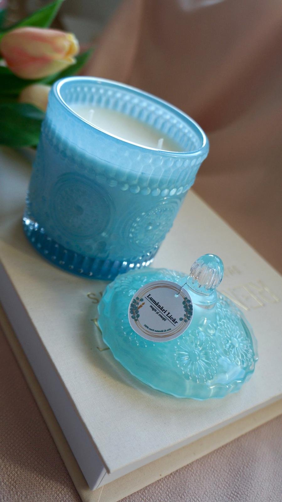 Lumânare parfumată elegantă în bombonieră de sticlă blue.