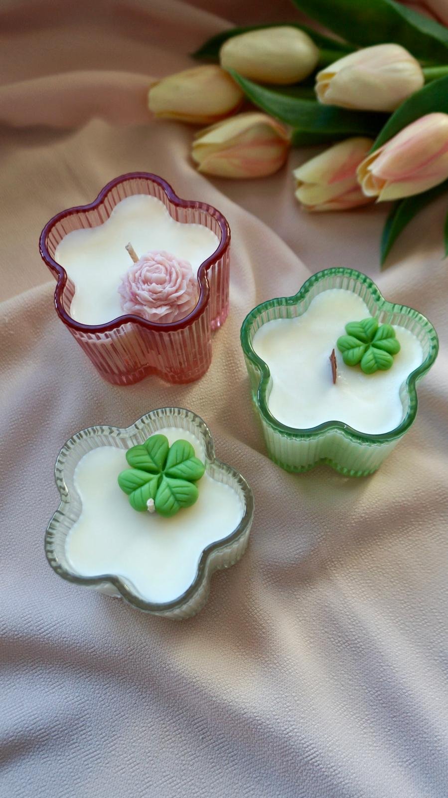 Lumânare în recipient din sticlă, în formă de floare – vesel și colorat.
