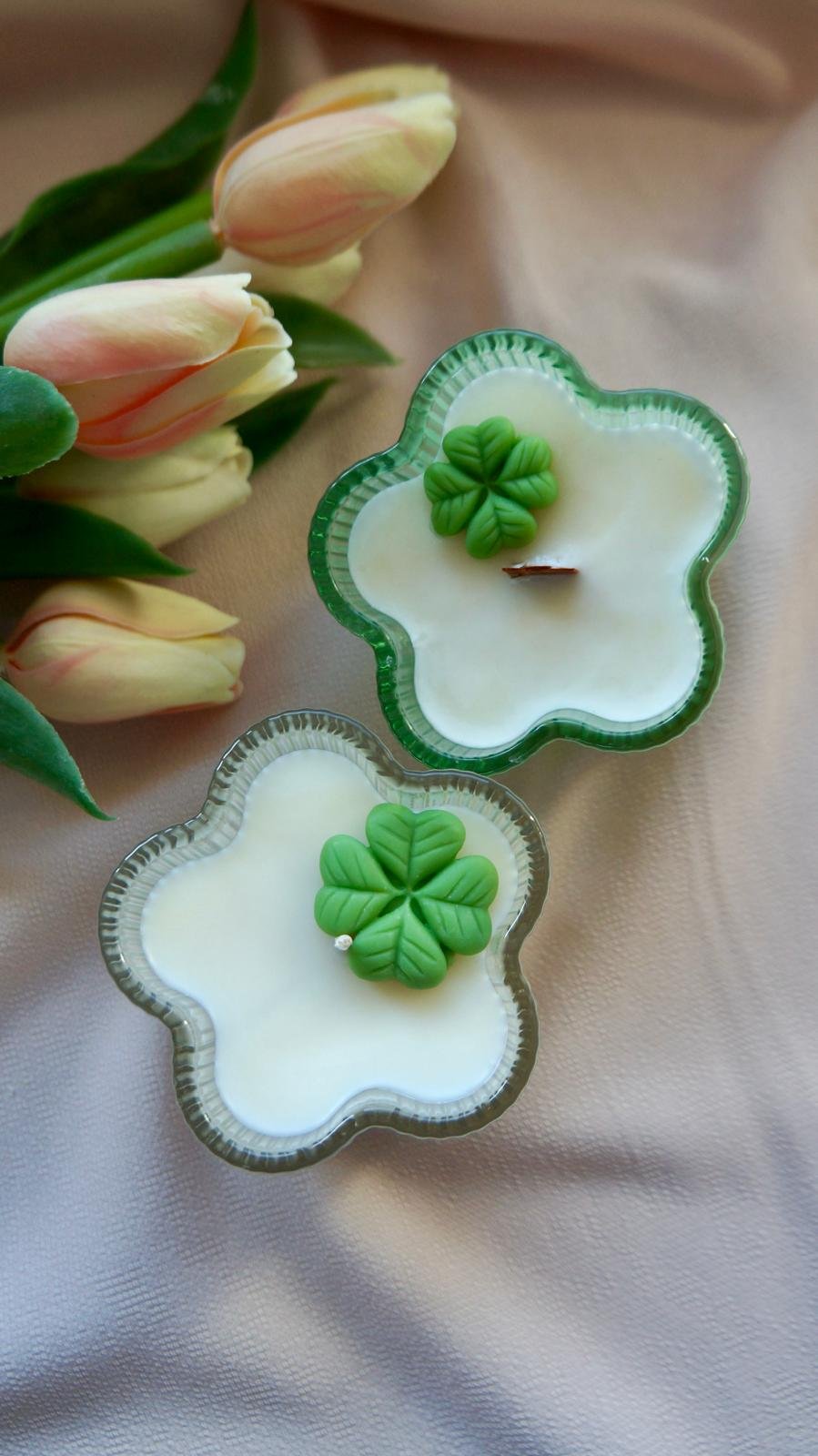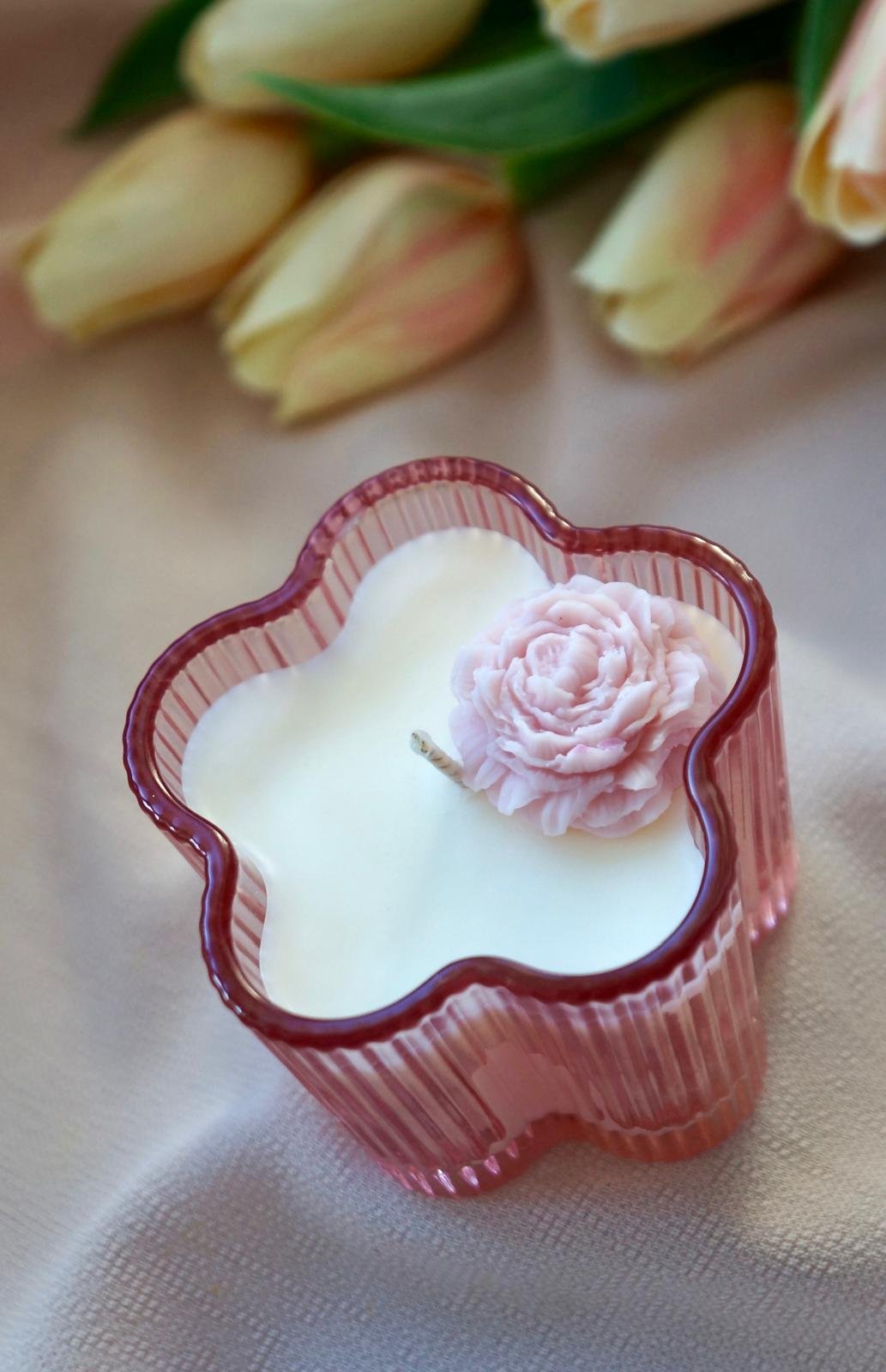 Lumanare parfumata din ceara de soia, in recipient vesel în formă de floare.