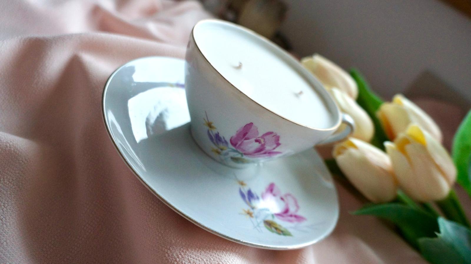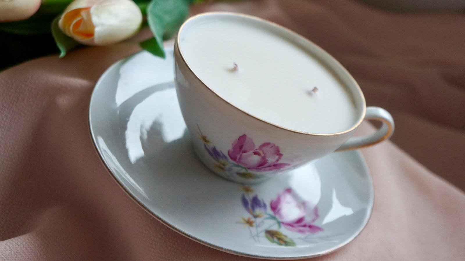 Lumânare în ceșcuță elegantă cu farfurioară, din porțelan cu motive florale.