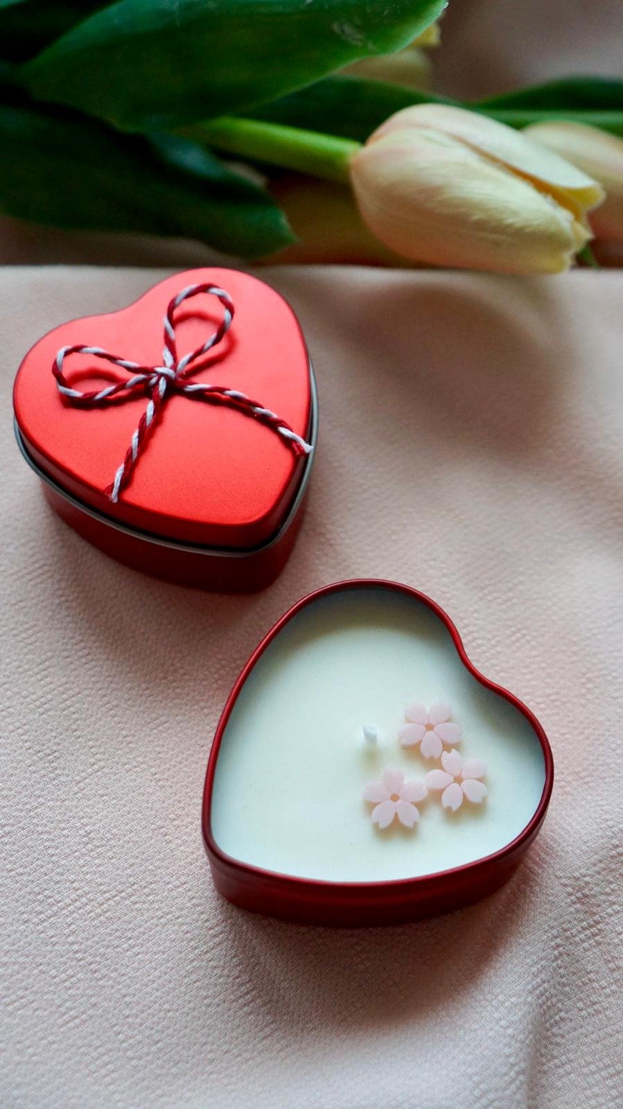 Lumânare parfumată din ceară de soia, turnată într-o inimioară metalică roșie.