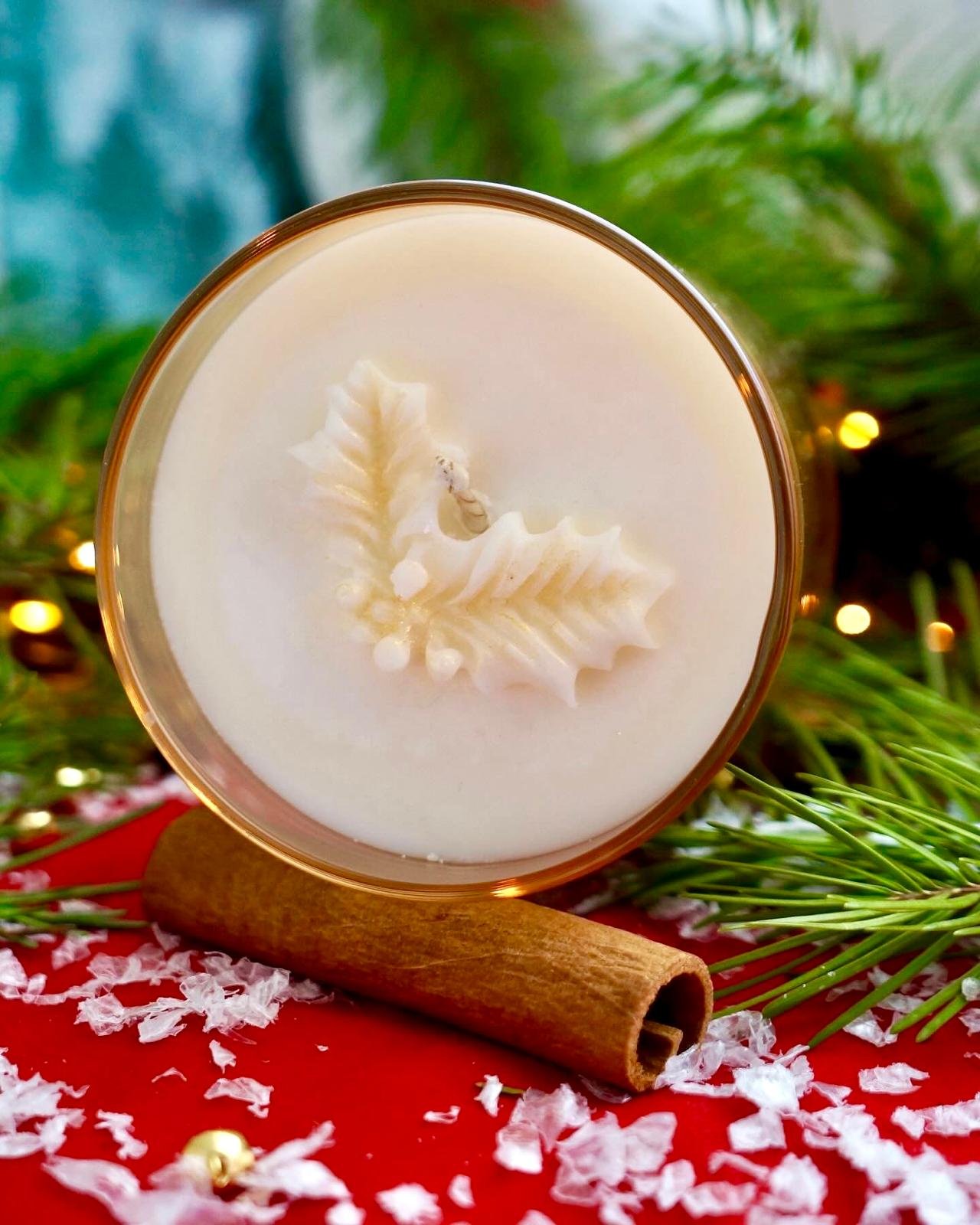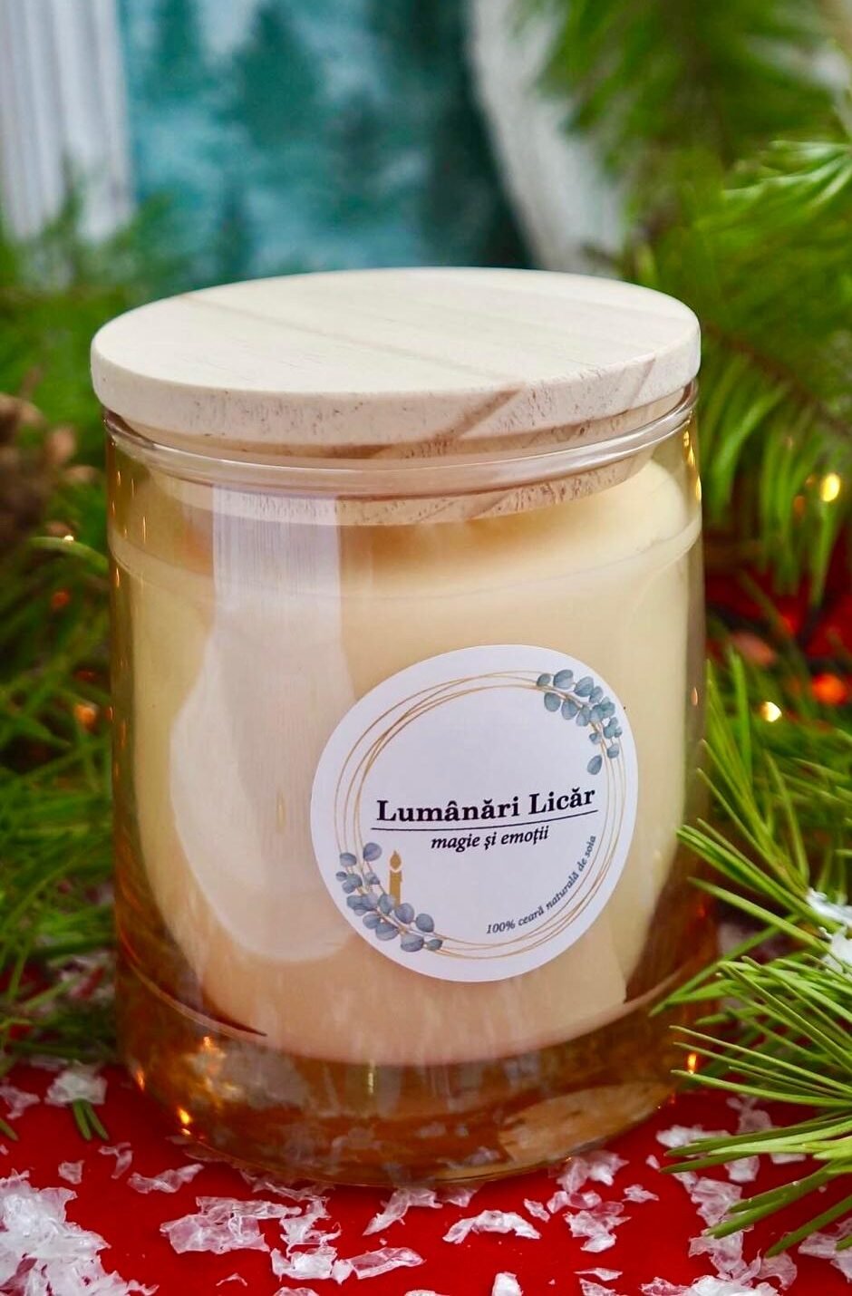 Lumânare parfumată elegantă în recipient  sticlă cu capac din lemn și decor cranguță albă.