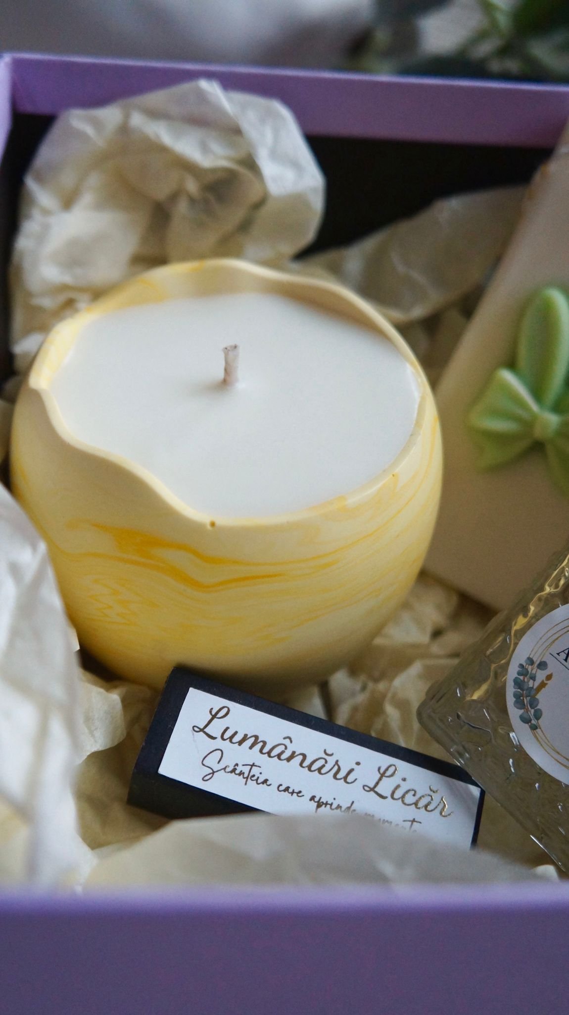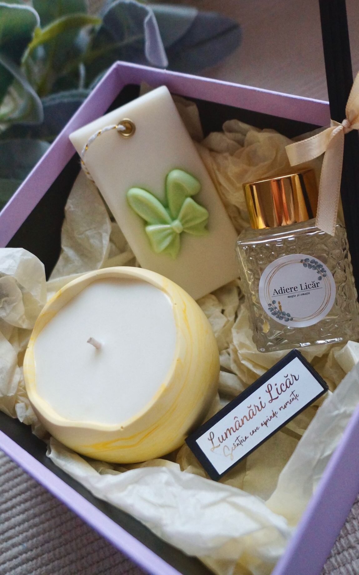 Setul este în cutie cartonată, colorată și conține lumânare, odorizant dulap și parfum de cameră.
