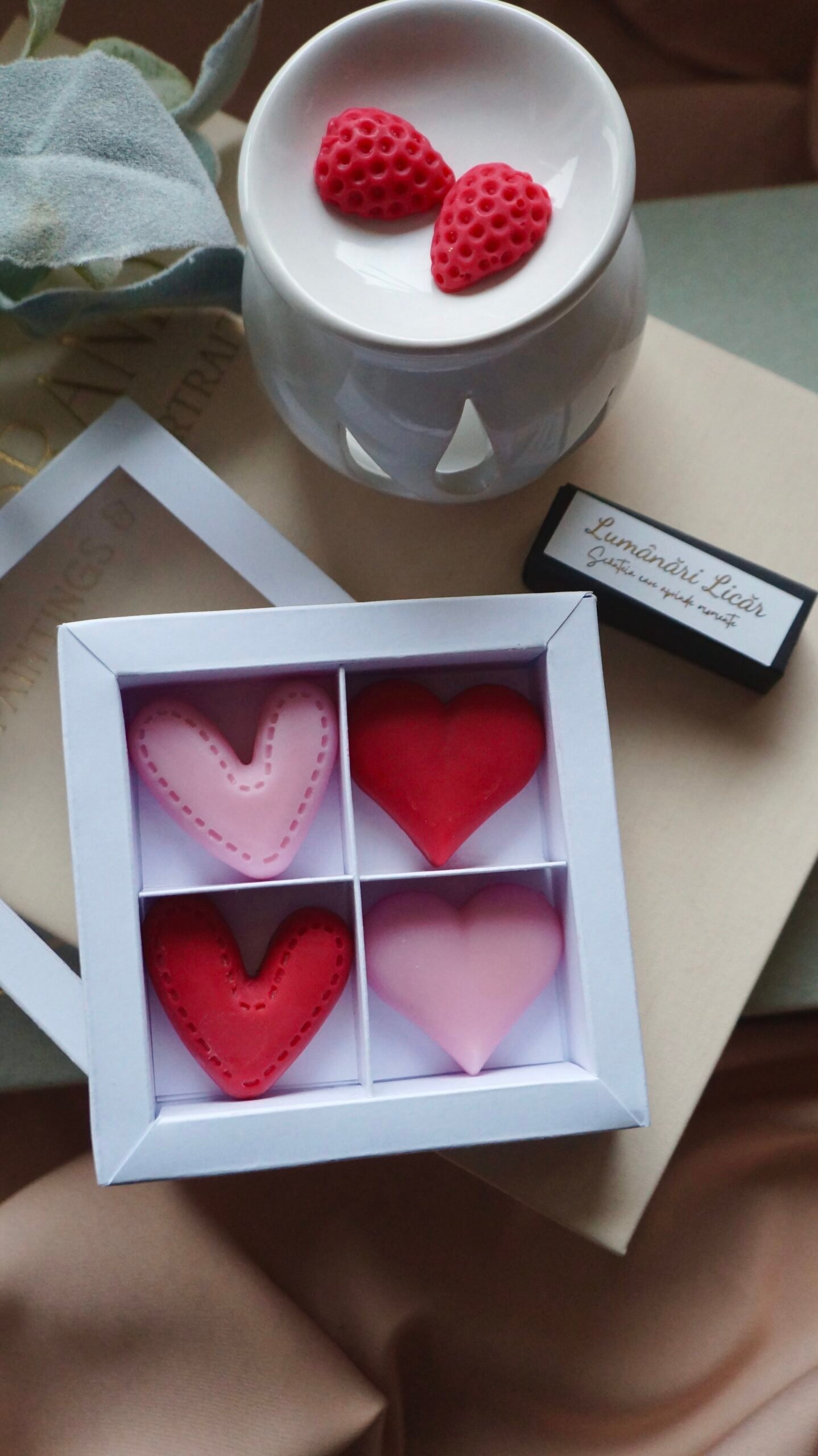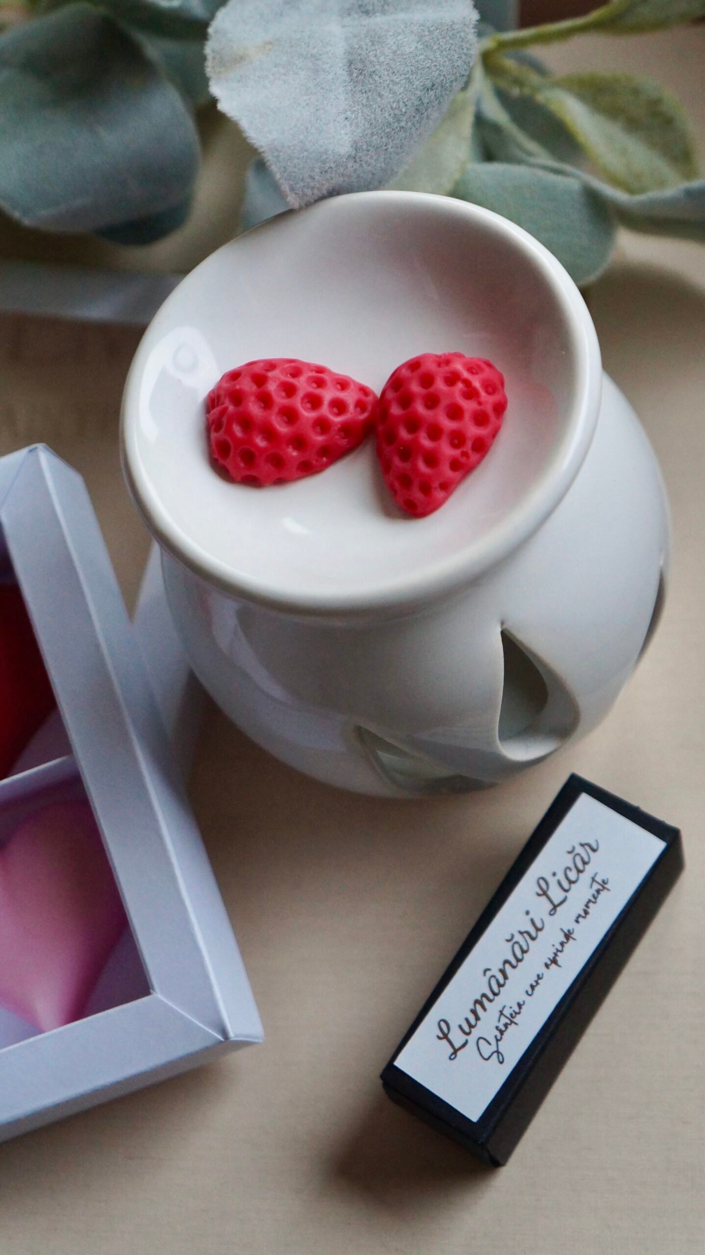 Set lampă ceramică pentru aromaterapie și cutiuță cu 4 licăriri parfumate.